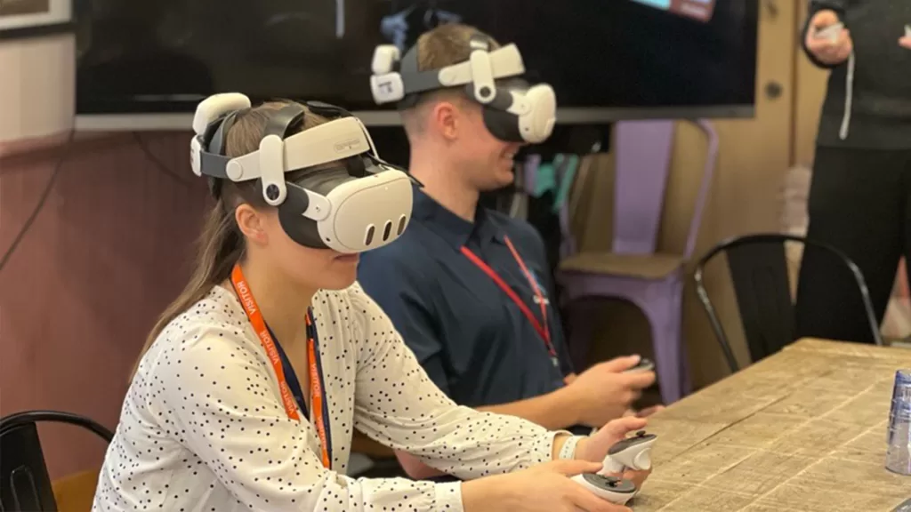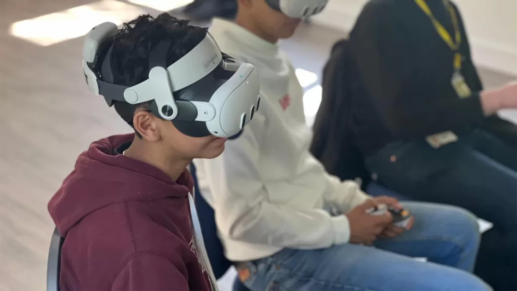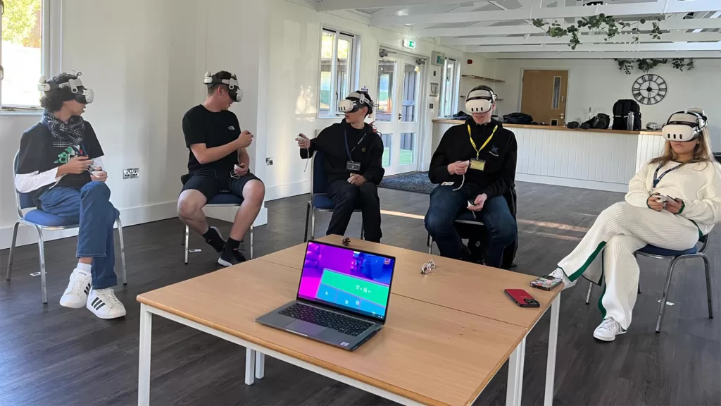 The majority of students are naturally drawn to VR. However, to minimise barriers to entry, Campus-XR also runs in 2D from a laptop. This is so that non-VR users can join VR users in the same environment to collaborate and explore as a team. Teachers can also run sessions from a laptop if they prefer.