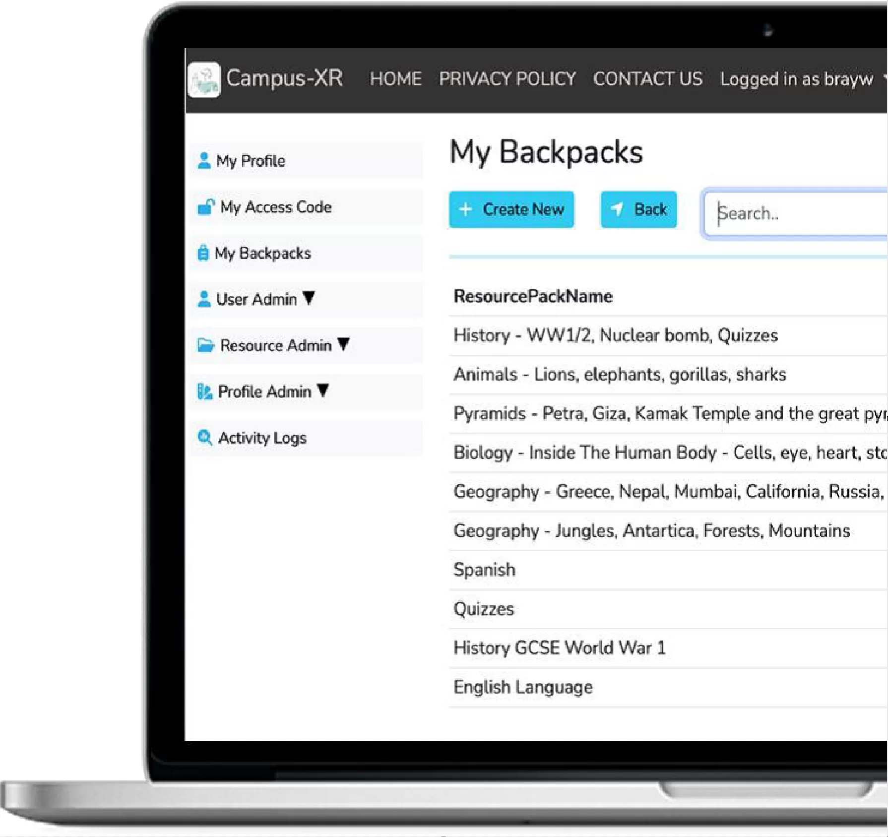 The Campus-XR Web Portal allows teachers to select from pre-packaged “lesson-ready” material across a wide range of subjects, or generate bespoke content