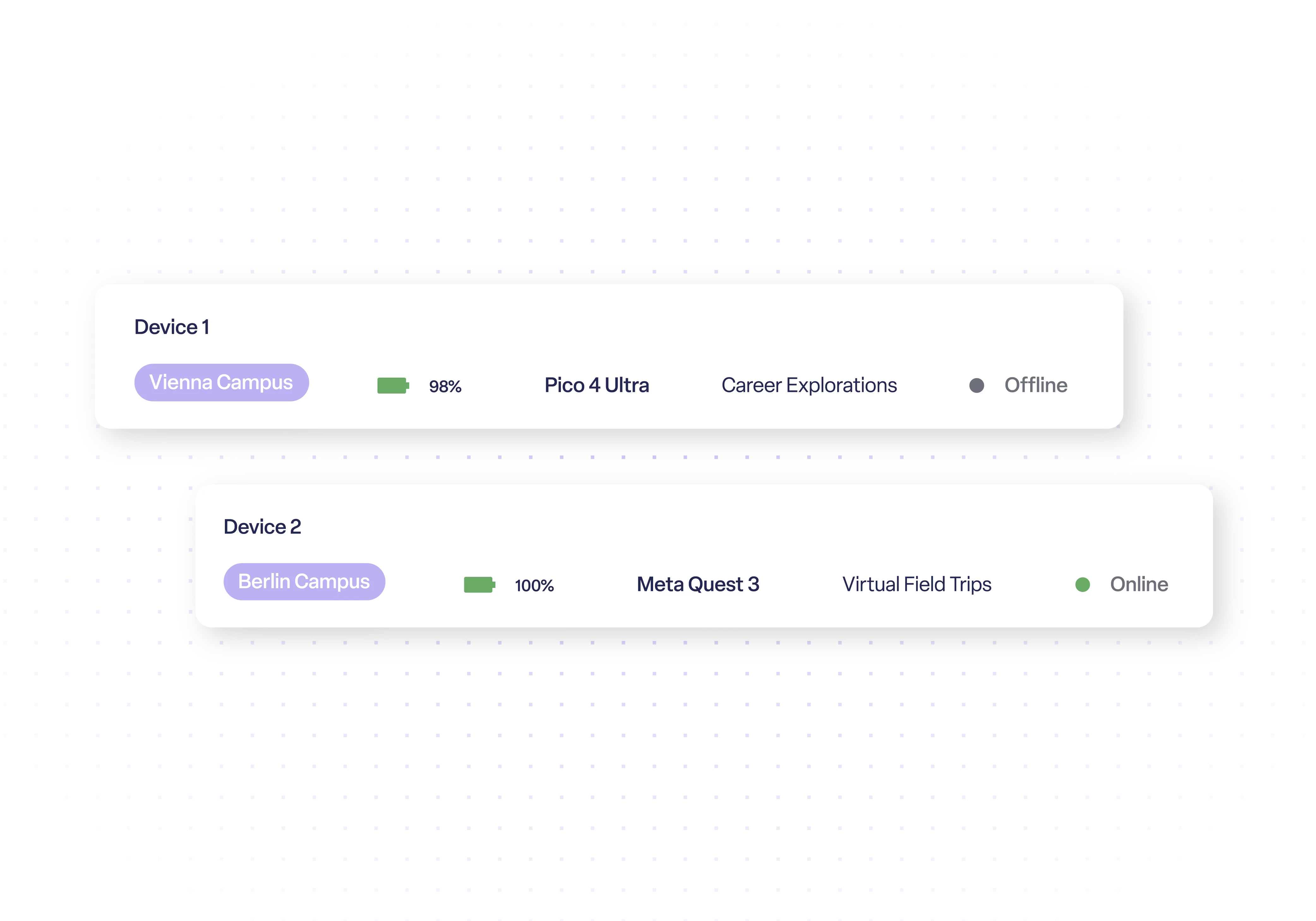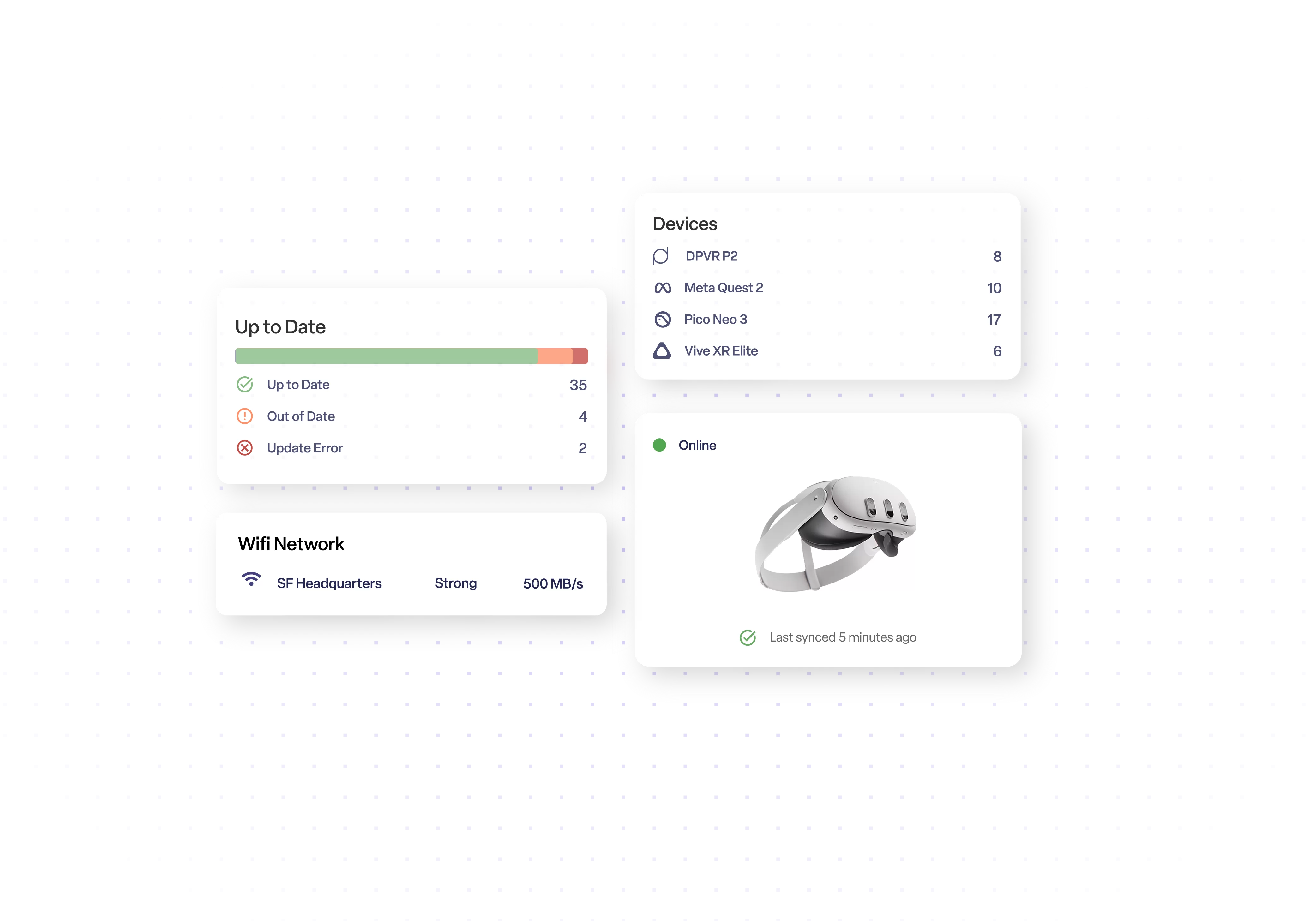 Remotely play and pause in-headset content like videos or WebXR links. View in real-time what the user is experiencing, with remote stream screening. Secure your deployment with the ability to remotely factory reset, remotely uninstall apps, and more.